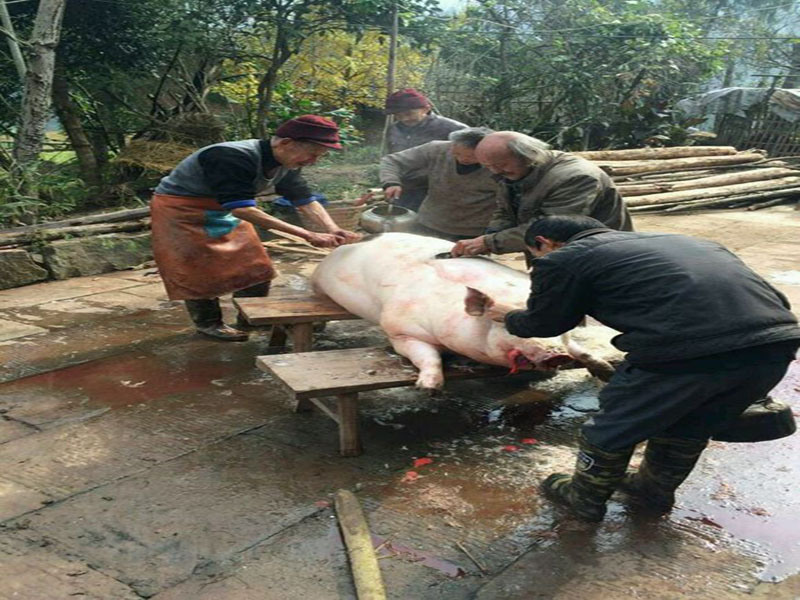 由于在外打工的父母还没回家,所以杀猪前婆婆都会喊周围的邻居来帮忙。打开猪圈门,猪出来了,杀猪的叔叔迅速抓住大肥猪的耳朵,叔叔抓住大肥猪的尾巴,使劲往外拖。大肥猪吓得“咧咧……”大叫。在大家的共同努力下,大肥猪被抬到长板凳上。叔叔用尖刀一下刺到猪的脖子上,取下来,当时血就哗哗地流了出来,起先爷爷会拿一个盆子接住血,这时飙的地上周围全都是血,让猪喘不了气,这时猪好像疯了一样,拼命的挣扎,但还是敌不过人,当血快流完的时候大肥猪也就死了,终于把猪降服了。