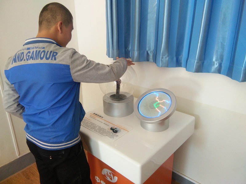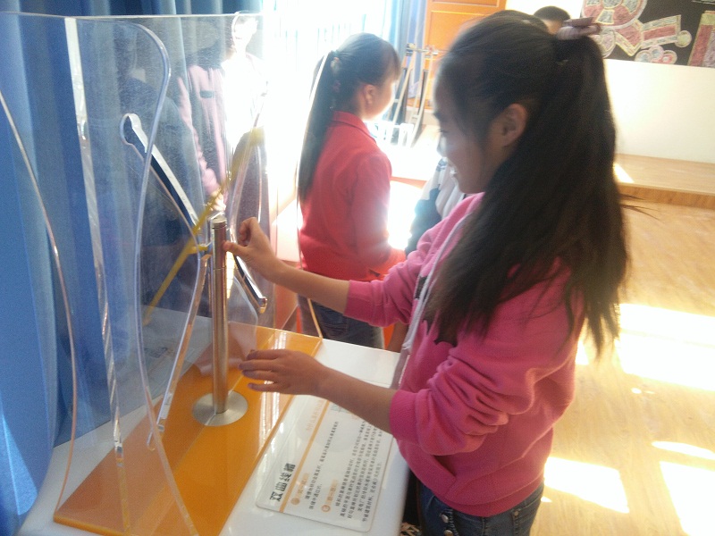 第一件展品就让我们吃惊不已,它的名字叫"旋转的银蛋",当我们不停地转动外面的手柄的时,玻璃罩内的银弹也开始飞速旋转,最终就会直立起来。同学们都对此百思不得其解,不一会儿便讨论的热火朝天,晓雯最为积极,她应用了我们刚学过的知识,果断地说:"因为银蛋周围存在磁场!"我们的学霸小松同学也不甘示弱:"还可能是因为有电流存在呢!"正当两人争得面红耳赤时,闫老师老师对此作出了解释。原来,银蛋周围确实存在一个磁场,只不过这是一个旋转而且变化的磁场,磁场内部会因电磁感应而产生电流,而电流受力的效应会阻碍磁场的旋转变化,所以银蛋最终与磁场同步旋转。而银弹是由空心部分和实心部分组成的,当它旋转起来时,在重力和向心力的作用下,空心部分向上竖起,使它转动保持平衡。呀,科学神的太奇妙了!一个小小的银蛋就隐藏着如此之多的奥秘,