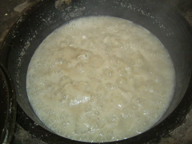 把清洗干净的猪皮放在大铁锅里,加一些清水,开始煮了。先用大火烧至沸腾,然后用小火慢慢炖七、八成熟了,再从沸水中捞也来,等猪皮凉了,再用切刀把猪皮切成小方块,然后再下锅,用小火慢炖。