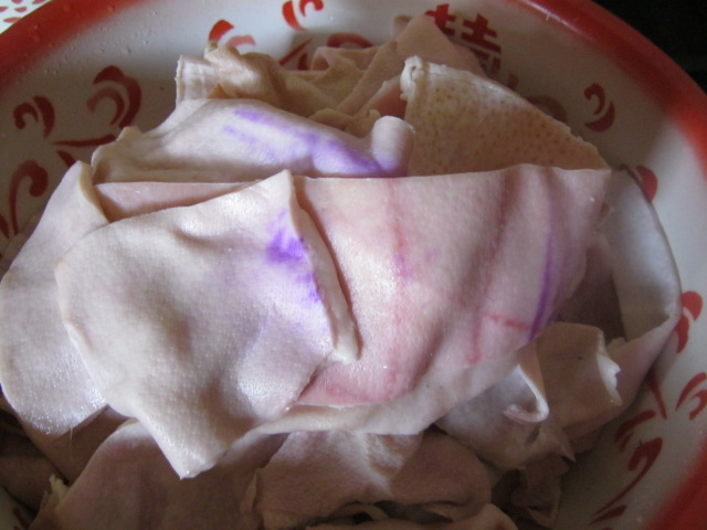 当然,猪皮动子做起来也相当麻烦。首先,要把猪皮表面的毛毛去掉进,最难的工作就是去毛毛。把大铁锅烧烫以后,把有毛毛一面的猪皮紧贴在大铁锅上,把毛毛烫了,最后再用清水清洗干净。