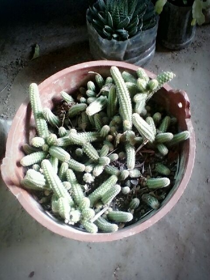 哈,别的我不知道。但这个可是了解的,它的名字叫"仙人棒",它虽然和仙人掌一样都有顽强的刺,它身上的刺摸起来是毛茸茸的。看,一盆子全是仙人棒,而且不用每天都给它们浇水,是你几个月不管它们,它们也照样生机勃勃。