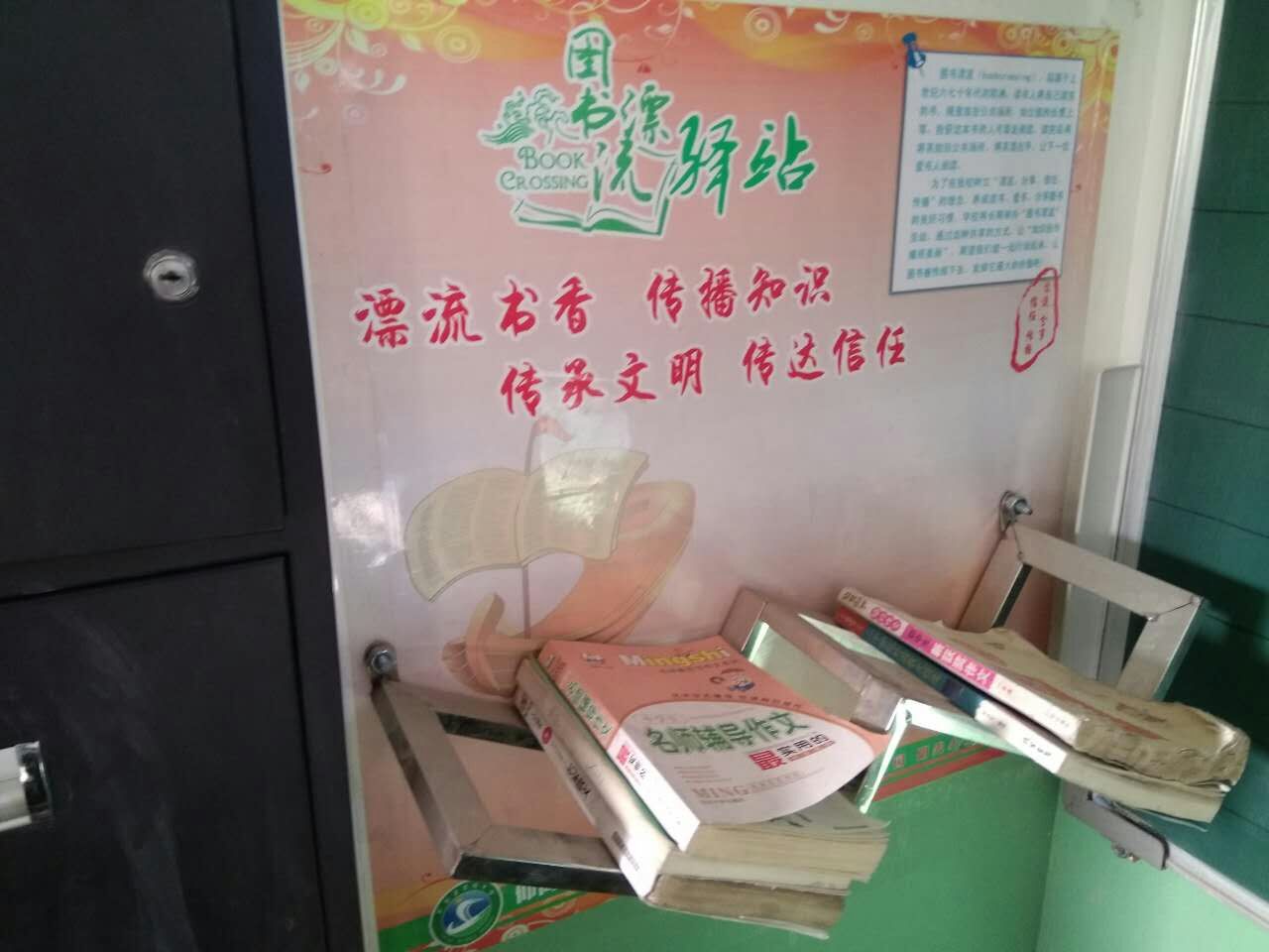教室的西南角是我们的"图书漂流驿站"。每每有闲暇时间,同学们都会在驿站驻留,徜徉在优美的文笔中,游山略水;沉浸在抒情的语句里,表情达意。"图书漂流驿站"增长了我们的知识,开阔了我们的视野,也调节了我们的课余生活。