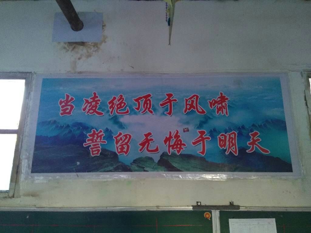 教室是我们学习的环境,营造良好的学习环境,可以使我们心情舒畅,信心百倍。所以我们每个人都很重视我们教室的布局,精心设计,细心布局,努力营造良好的学习氛围。东墙上写着"当凌绝顶于风啸,誓留无悔于明天"激励着我们今日事,今日毕,不虚度光阴。