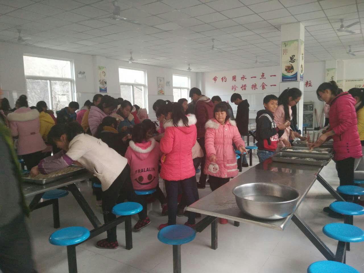 住宿的高年级哥哥姐姐也来餐厅了,不会包饺子的男生认真的向女生请教,有着一双双巧手的姐姐们乐此不疲的告诉他们包饺子的窍门。快乐的笑声,弥漫着整个餐厅,大家干得热火朝天。