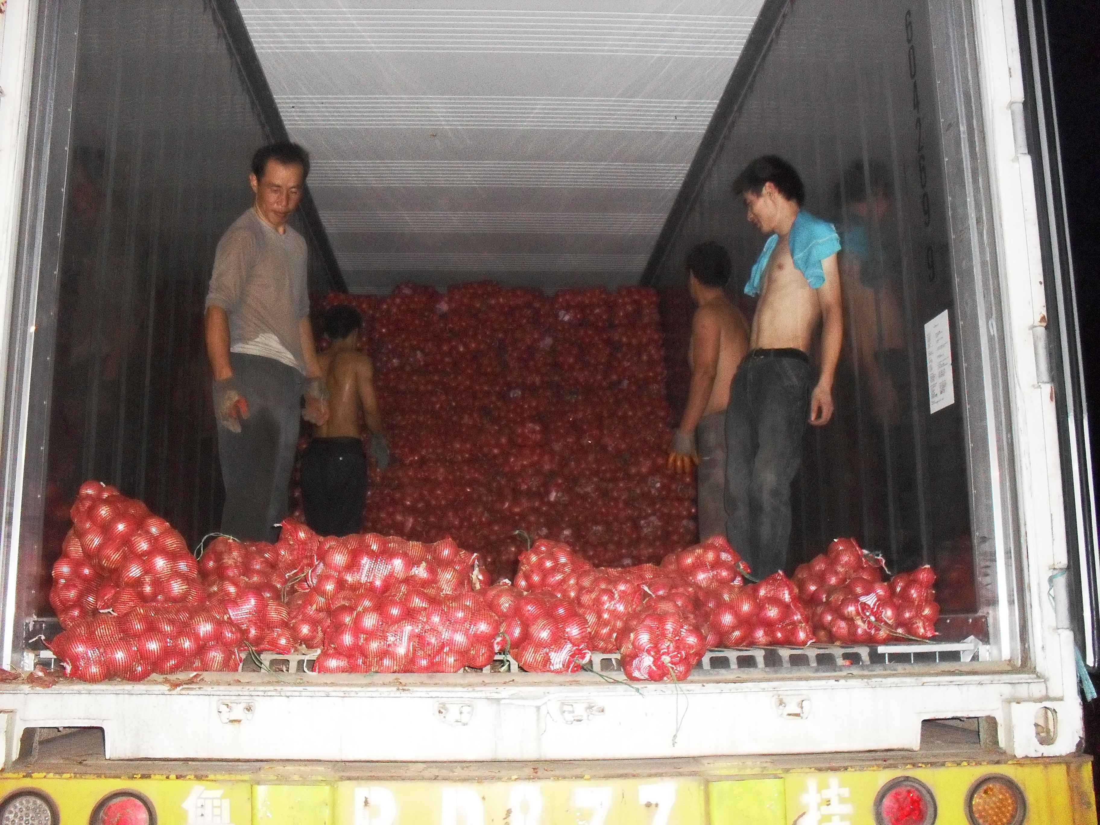 接下来,洋葱贩子就开始装车。他要把洋葱进行分类,大上点,好看一点的,装在上面,他可以按照上面好的卖价,能大赚一笔呢!