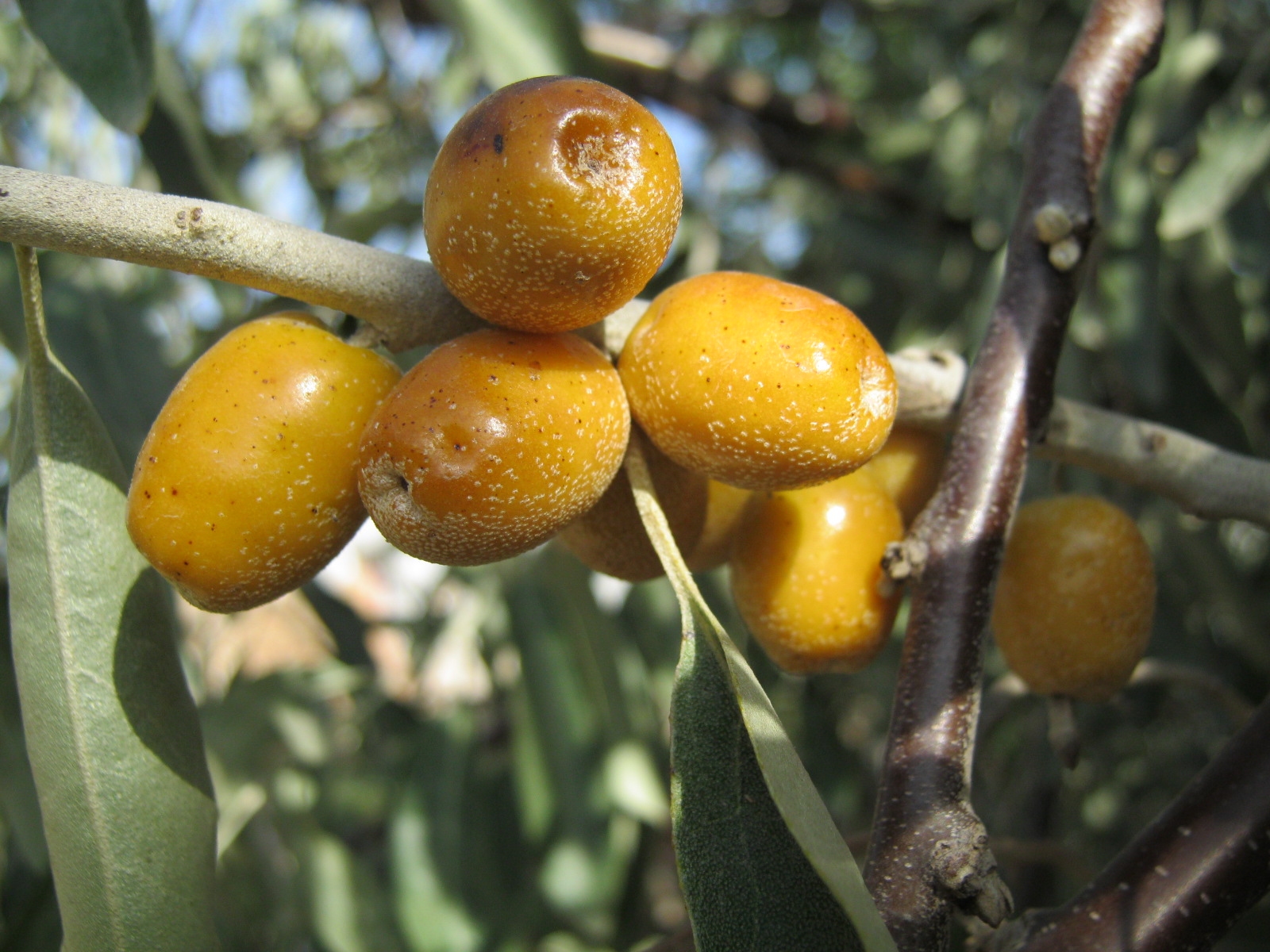 这散发着金子般光芒的是沙枣子。这东西并不常见,在沙漠边上却随处可见。沙枣儿开的是黄色小花,七、八月份结的是青绿色的小果子,等到十月份成熟了,就变成金黄色的,吃起来涩中带甜,甜中带涩。