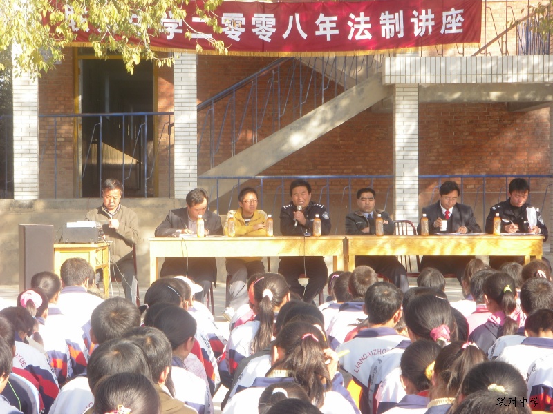 你看!这是我们学校的"法治讲座"。瞧!台下同学们听得多专注啊。这种讲座在我们学校每学期都要举行的。