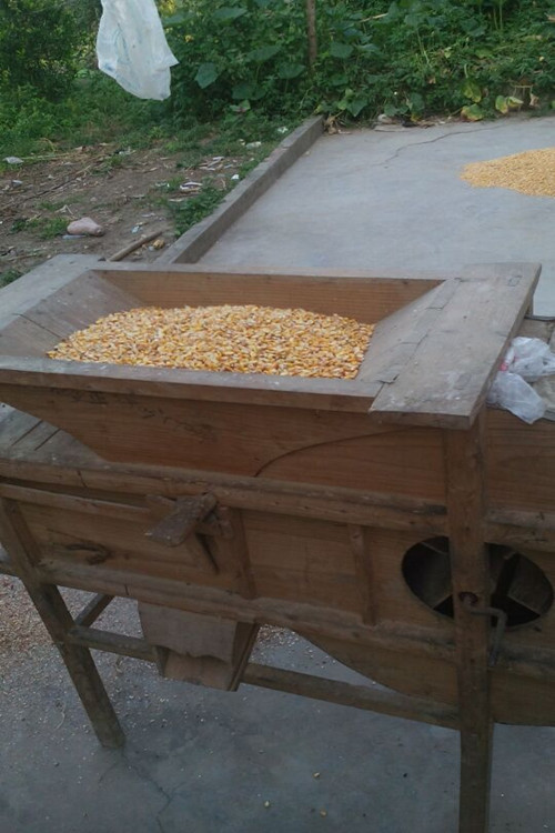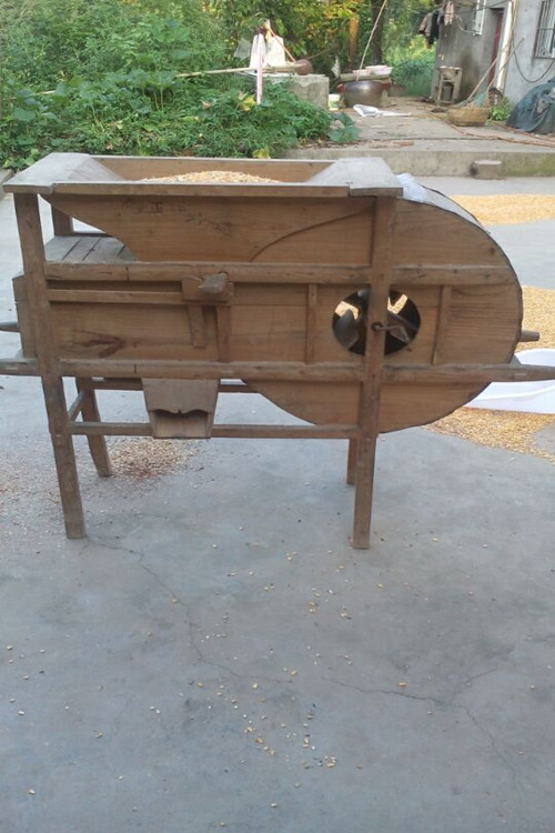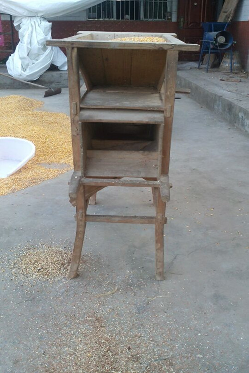 木风车由漏斗、鼓(风车的肚子)、出口、出风口四部分构成,整个躯体由四条腿支撑着。风车顶端是一个大漏斗,被车(扬)的粮食就放在漏斗里边。漏斗下面是一个圆形的大鼓,里面装有扇叶,转动扇叶粮食里边的杂物灰尘就被车(扬)出去了。风车两边各有一个出口,紧挨着大鼓的出口车粮时出来的是颗粒饱满的粮食,距离大鼓远一点的出口扬出来的是泥沙和颗粒不饱满的粮食。前面是出风口,车粮时扬出去的是灰尘和糠壳之类的东西。控制粮食流量还有一个开关(我们这儿称管家婆),在漏斗下面,只要把它移动到左边,漏斗里的粮食就会一涌而出,越往左出来的粮食就越多,杂质也就越多。所以想要车出来的东西干净,那就不要把管家婆往左边移太多。要像车出好粮食就要控制好管家婆。