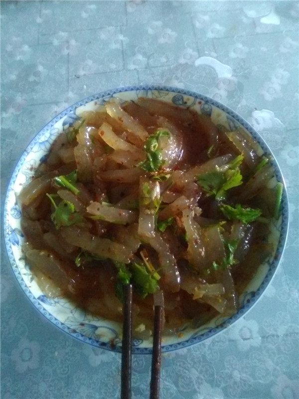 擀好之后,用刀切成条状放置在一旁。最后,将锅中添水,烧开后便可以将手擀粉下进去,煮两三分钟就好了。为了让它更美味,老妈还剥蒜沓成蒜末,放入盐,胡椒粉,将热油向上一浇,发出哔哩啪啦的声音,别提有多馋人了。