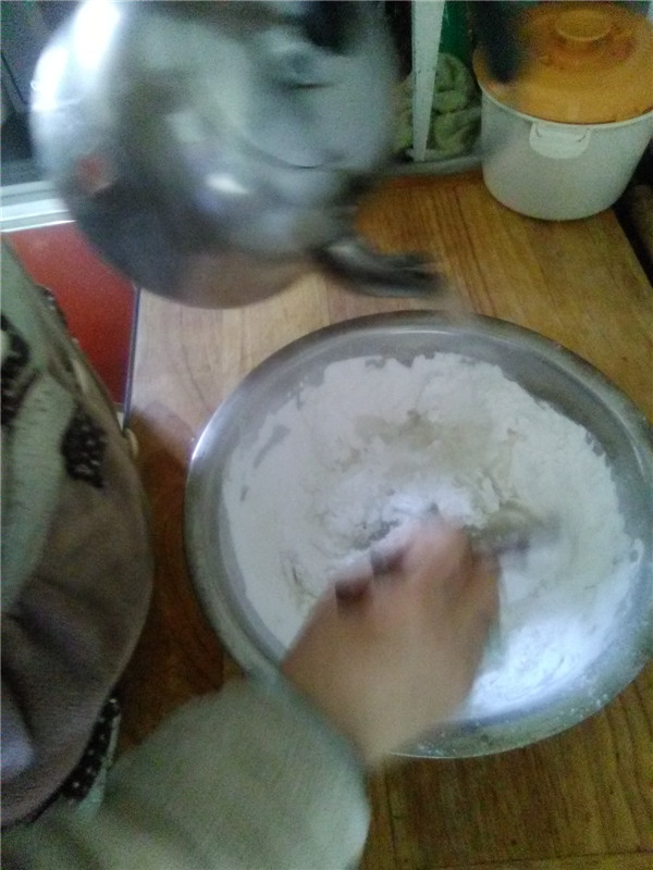 首先,将面粉盛入盆中,将一指甲盖的明矾擀成粉末放入其中。明矾在此的作用其实就是为了让手擀粉吃起来口感更好,但是明矾容易伤身,所以只需一指甲盖的即可。然后将烧开的热水倒入面粉中并不断搅拌。最后就像平时揉面一样,反复揉,拿擀面杖擀成一张饼的形状。趁热乎,多擀几下,面粉因为加了明矾的缘故,变得特别顽皮,不听使唤,所以要趁热多擀几下。