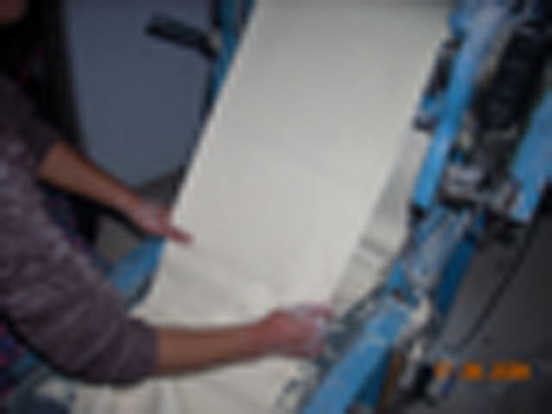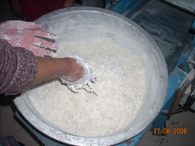 之后就把刚才拌好的面放在压面机上,开动压面机。这样面就随着压面机慢慢移动。刚开始压面机压出的面很不规则,但你将面反复多压几遍,面条就逐渐成型。但这时候千万不能将面条拿出来砌。因为面还没有压好,这种面如果做成面条,煮在锅里肯定会变糊的。因此在压面机来还要多压几遍。