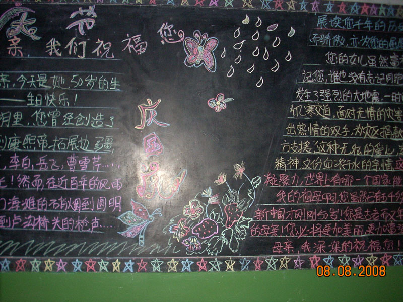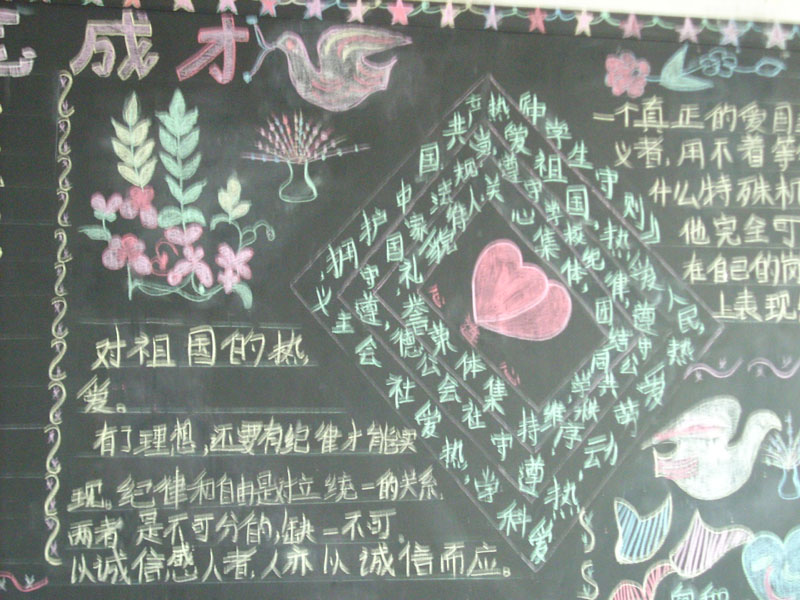 很快,我们的黑板报就这样完成了!总体上看还是蛮漂亮的。我真是很惭愧,因为我的字写得是一塌糊涂,经常还挨老师的批评,而且画画更别提了,我明明画的是只猫,可我们班的同学偏偏说是狗,弄得我好难堪。我要好好练习字体,等以后办黑板报我也要露一手。