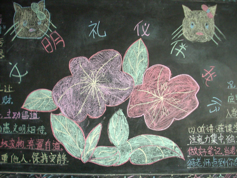 于是,我们就七嘴八舌讨论开来,最后确定将这期黑板报的主题确定为文明和礼仪。然后我们就分头行动。首先第一位和第二位的同学查资料;第三位和第四位的同学布置版面,第五位的同学负责在和板报上画画,而最后一位同学在黑板报上写东西。分工完毕后,布局版面的同学开始布局版面了,而画画的同学等到版面布局完成后开始画画,这些同学看起来平时学习也不是很好,但是画画的本领可真高,瞧他花的莲花象真的一样。