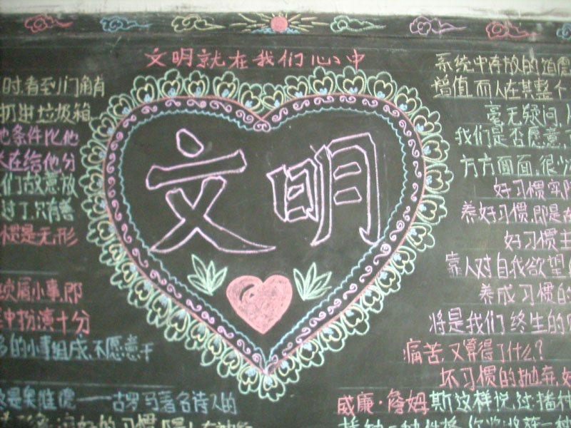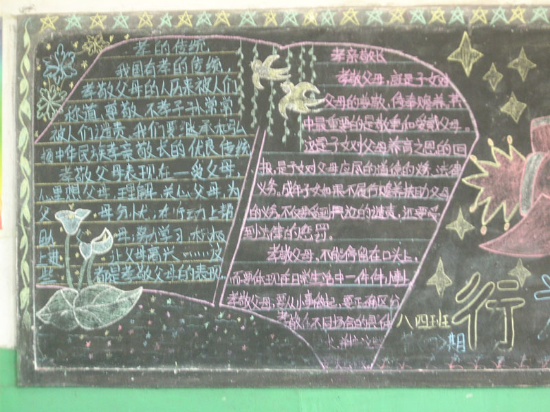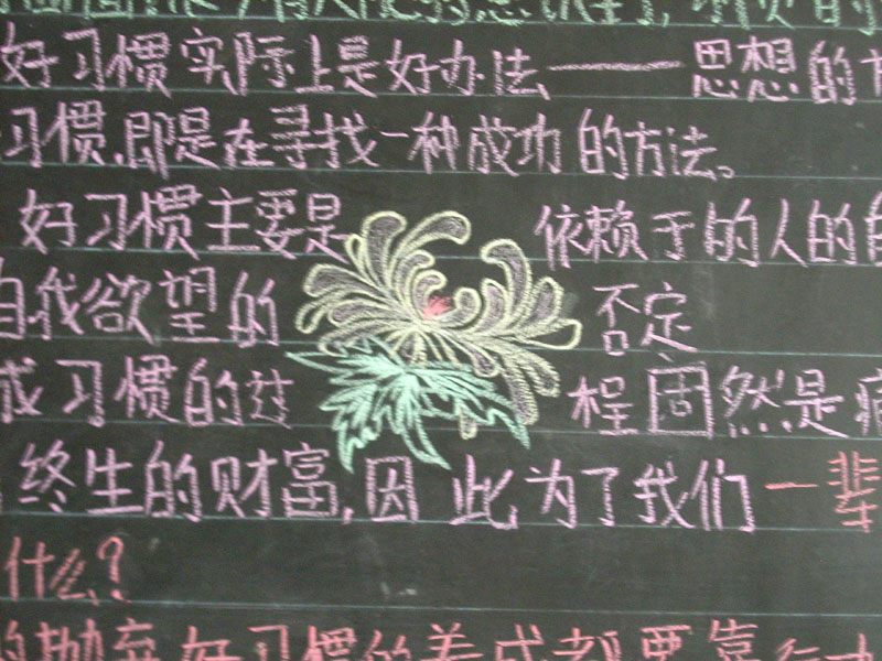第二天我先参照了隔壁班的黑板报,之后我就动手办自己班的黑板报。首先,我找我的死党帮我把黑板报的花边做上,之后又让他将写字的线用粉笔灰打上。剩下的任务就是我的了。首先我用彩色粉笔装点黑板报,然后画上图案。最后就剩下写字了。还不错,小时候我们的语文老师让我们把字写好,这回我的不难看字终于派上用场了。