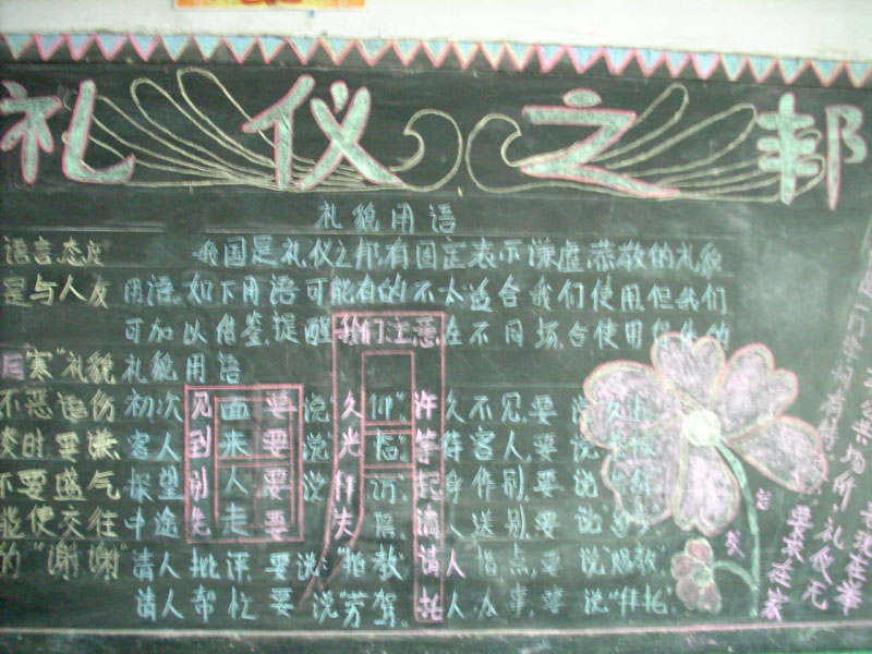 于是在回家放学的路上我在琢磨,这期黑板报办什么内容呢?刚好那天中午我路过隔壁班的时候发现他们办的事关于文明语言之类,哎何不我们也办一期关于文明礼貌主题的黑板报呢.于是回到家里,我翻开我们的政治书寻找到了关于中学生文明礼貌的材料。晚上躺在床上我就思考如好设计版面呢?不知不觉就进入了梦乡。
