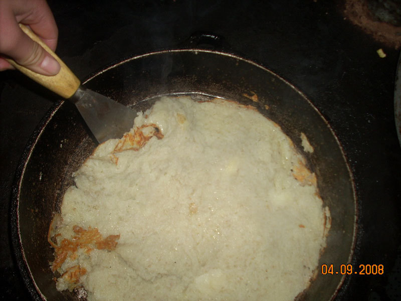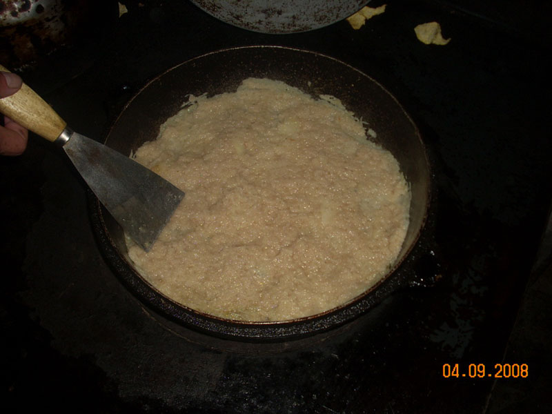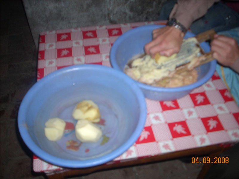 烙饼子其实很简单,首先把洋芋用洋芋叉子叉成洋芋糊糊,然后把洋芋糊糊中的水拧干。在拧干后的洋芋糊糊中放入面,当然还要放一些调料,比如盐、花椒等。再将这些东西搅拌匀了。这样第一步工作就算完成。第二步就开始烙了。首先在锅里倒上油,等油烧好了之后之后在锅里将刚才做好的洋芋糊糊放进去用铲子抹平。大概4分钟左右,会散发出洋芋的香气,这时把它反过来烙饼子的另外一面,等到老好之后就可以出锅了。