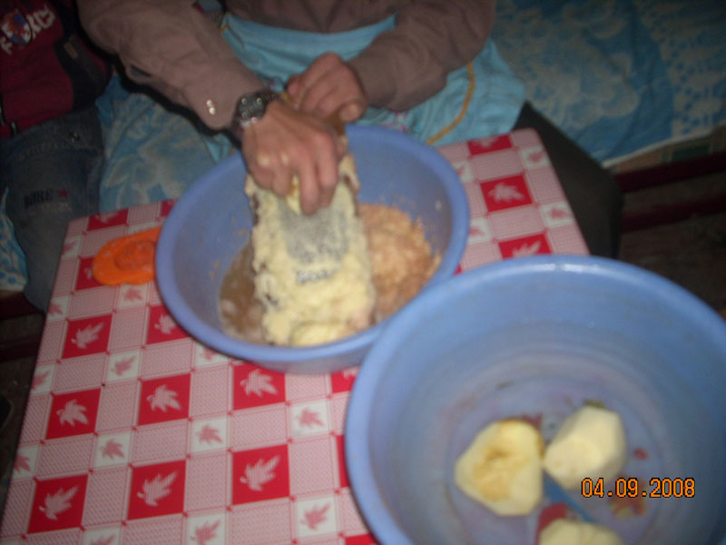 说到烙饼子我先要介绍一种工具叫做洋芋叉。这种工具是烙洋芋饼子必不可少的工具。它是用一块薄铁片做成,在天片上用钉子钉上许多小孔,之后再在铁片周围用木条绑住。这样一个洋芋叉就做好了,我在家里见过我爸爸做洋芋叉的过程的。