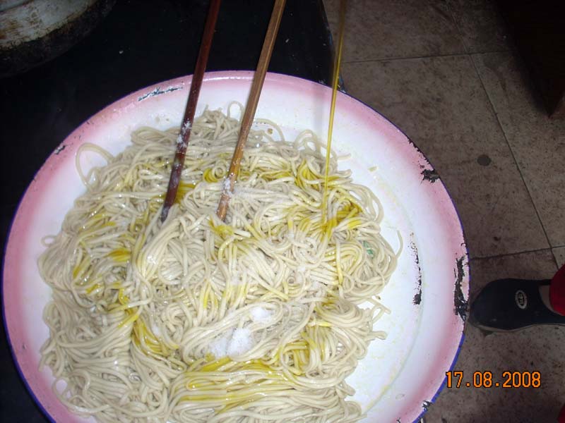 之后再从冷水中把它捞出来,放在大盘子里或者是面板上。之后在上面撒一些食盐然后倒上清油。之后就用筷子慢慢搅拌,当然搅拌的速度不能太快,因为如果太快的话,面条还是会起疙瘩。用快子搅拌的时候也不能经常搅拌,因为经常搅拌,面也会不好的,要停一会搅拌一会。