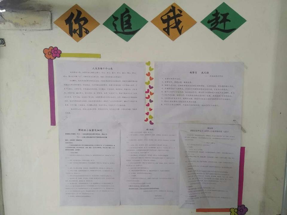这里是你追我赶的世界。小小文章"人生历练的心态","我努力我无悔"等等。这里是我们努力拼博的阵地,这里是我们洒满汗水的取得成功的发源地。教室,是我们通向成功彼岸的途经地,我们每个人都会一步一个脚印,踏实地走下去,走下去。