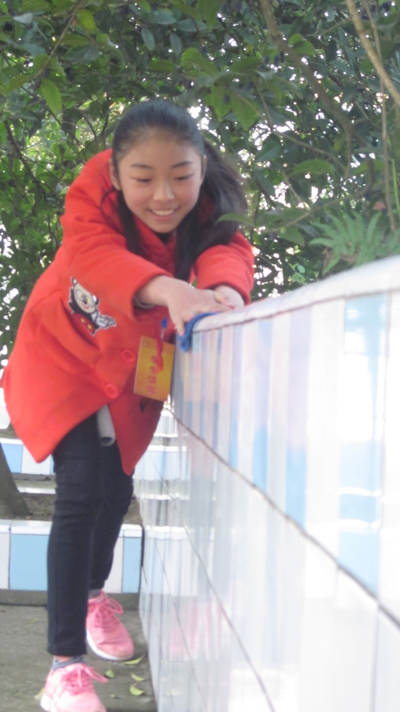 清晨,她总是早早的就来到学校。但她并没有和同学们围成一堆,玩游戏,聊家常,而是拿起抹布,来到楼下,把抹布仔细清洗净后,来到花坛旁用抹布认认真真地抹起来,不一会儿,花坛就变得干干净净了。看到这些,我想:正是因为学校里有许多像她一样的人,我们的校园才变得那么整洁吧!