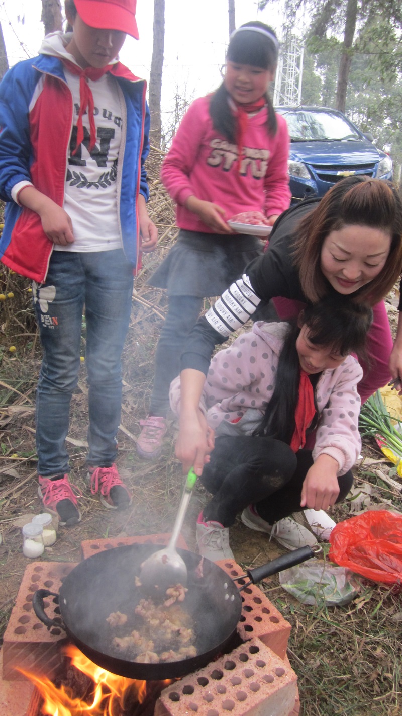不知不觉中,一个小时过去了,做饭的时间到了。我们各组拿着铁铲开始挖灶:先挖了几个坑,再挖一条递柴火的通道,在坑上放几块火砖,烧燃火,放上锅就可以了。我们班采取的是分工合作制,各组有各组的任务,我们组的任务是煮腊肉和煎饼。我先把水倒进锅内,然后把洗干净的腊肉放进锅里,让一个同学专门负责烧火。在煮腊肉的同时,我们又开始煎饼:先把面粉、鸡蛋和水一起倒入盆内混匀,把面团揉好后放在平板锅上煎。许多热心的同学都来帮忙,等饼变成金黄色后,就可以起锅了。起锅后的饼子香味四溢,令人馋涎欲滴。不一会儿,腊肉也煮好了,我们把肉切出来,装在盘里。我向四周一看,其它都已完成任务,我也连忙把腊肉和饼端上来。看着满桌的美味佳肴,我们是垂涎三尺。