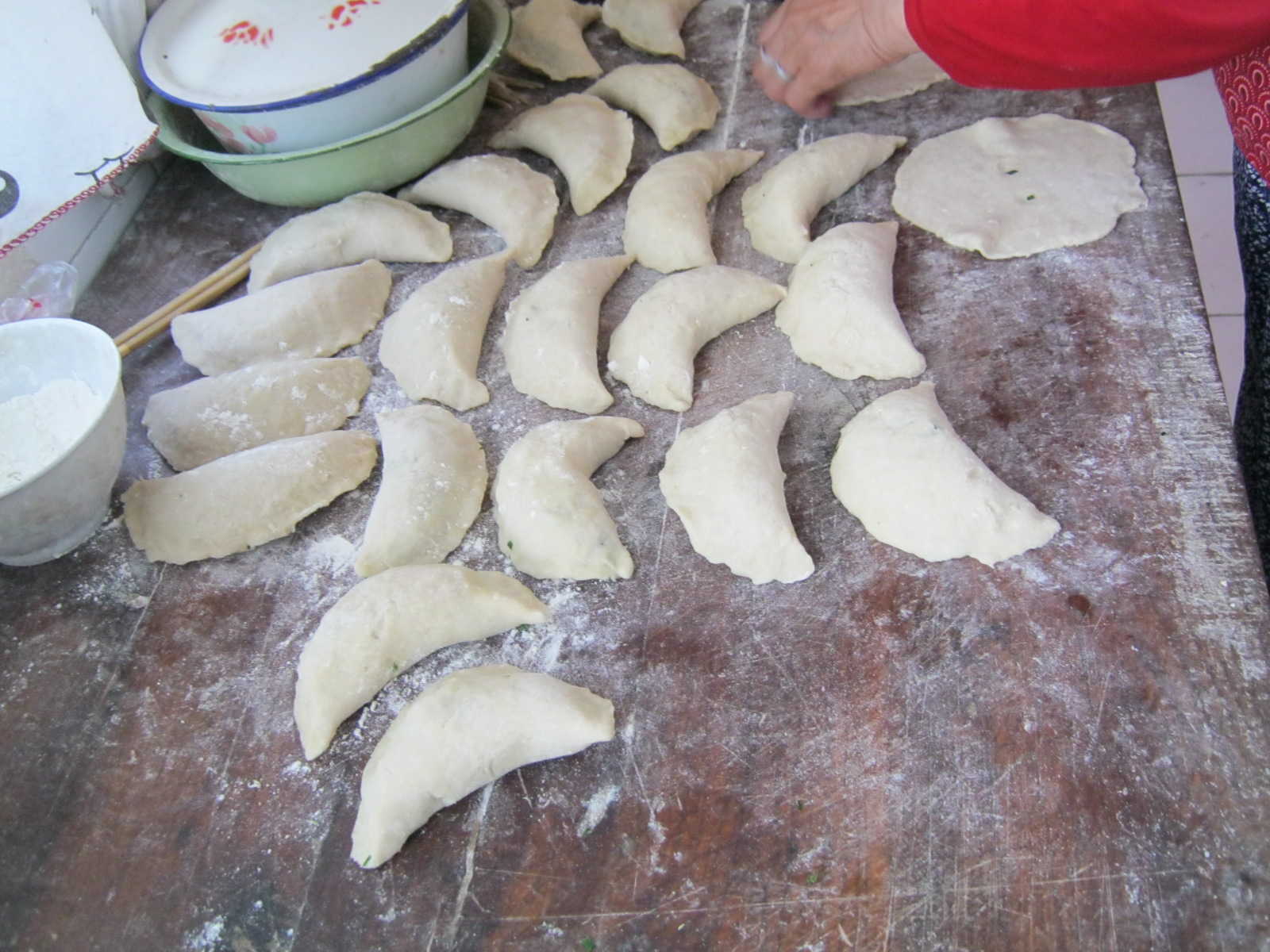 接下来,把揉好的面,揉成细长的圆柱形状,用刀切成一个个小小的圆柱体,用面杖擀成一个个小圆片,然后,把拌匀的鸡蛋韭菜馅儿放进去,用手包好。