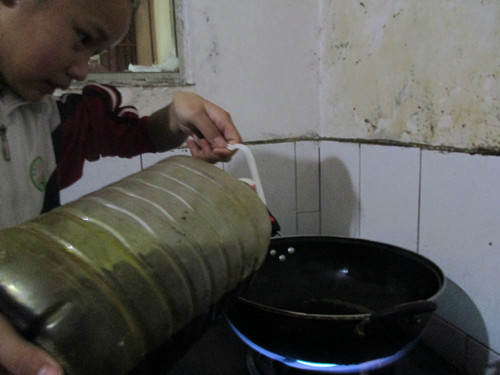 我好不容易将芹菜切好了,我又将各种香料也切好了,下一步将要炒菜了。我按照妈妈的指示,先把锅加热。只见蓝色的火苗欢快地舔着锅底,锅里的水珠慢慢地消失了,可以倒油了。我用力拿起一壶香油,靠在锅边稍微一倾斜,香油就出来了。"别把油壶靠在锅边!壶是塑料的呀!"我连忙把油壶拿下来,可锅里才倒了一点油。香油在锅里慢慢散开,冒起了很多小泡泡。妈妈叫我站远一点,而我看得正高兴,自然是对妈妈的劝告置若罔闻。不知怎么回事,"吱吱吱……"香油突然溅了起来,有好几点溅到了我脸上,疼的钻心。我正准备躲远一点,却被妈妈大声喝住了:"快倒菜!锅都快烧红了,你准备上哪儿去?"听着妈妈这不可抗拒的声音,我只能自认倒霉,硬着头皮去倒菜了。