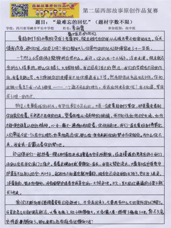 一个刚上小学的孩子能够明白些什么。或许,人认为一个小孩子,涉世未深,根本就不会明白人情事故。那么你错了,大错特错。我已经有了自己的想法:我们的学校在不同的方向,我喜走路上学,为了挣脱你的束缚我不让你接送我上下学。然而却因此永远失去了你。你如此狠心竟丢下我一人去了那里——一个遥不可及的地方。我该如何来寻你呢?我不知道,等待成了唯一的方式。狗是人类最真诚的朋友,我坚信事实亦是如此。大黄一直在黄杨树下等你,那是最先看到你回家的位置,可迟迟不见你的归来。望着你难以凝神的眼睛,我不知该如何与它交流,如何才能使它恢复以往的精神。心中一遍又一遍地呐喊着:你快回来吧,我们一直在黄杨树旁等你。人们常说不论一个人在什么地方,如果他思念你,那么他一定会来到你的梦中与你相会。为什么你不来,我应该一直霸占着你的梦吧。