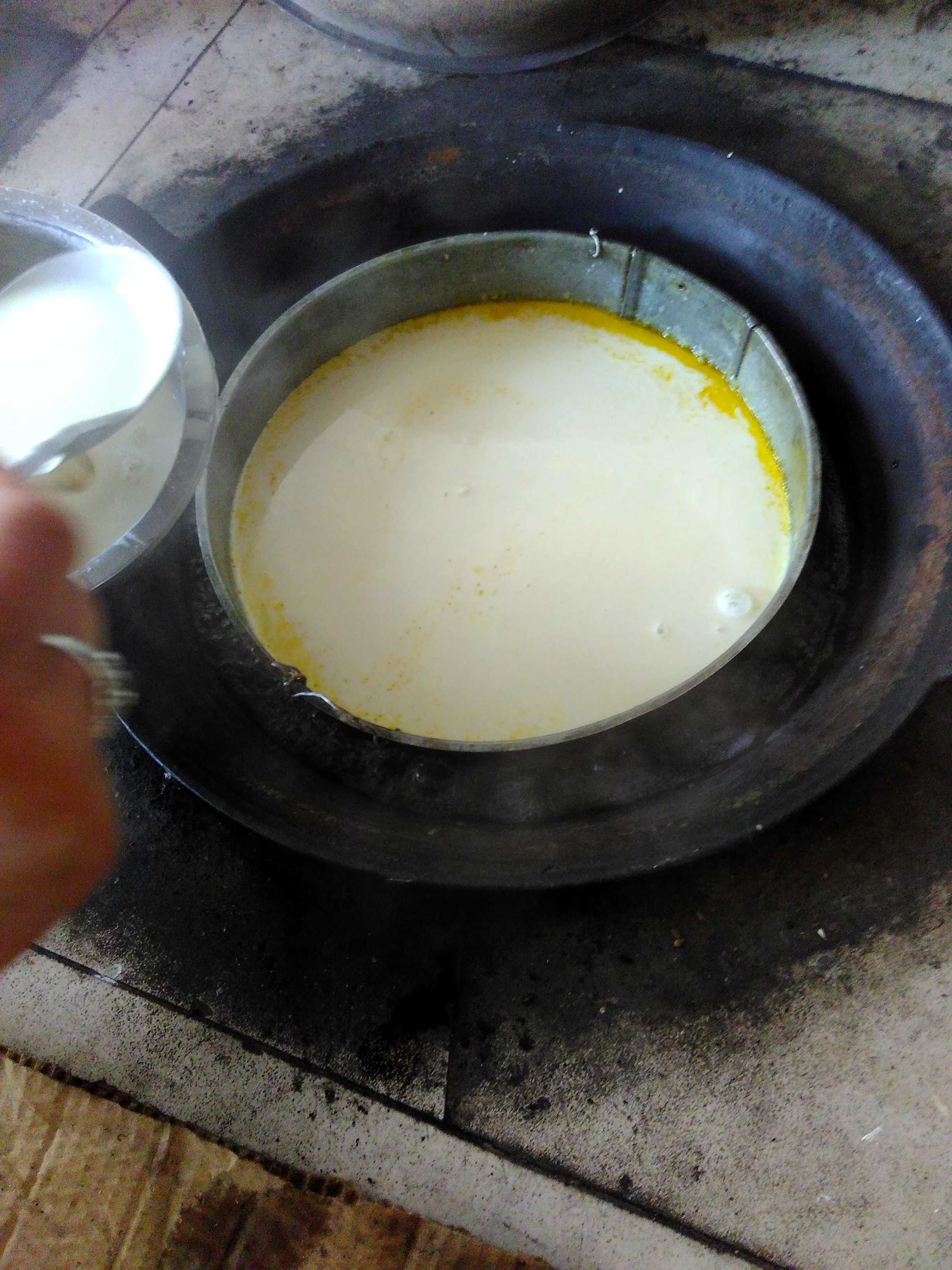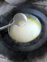 面筋是用小麦粉、荞麦粉等制作而成的。首先要把面粉在水中充分搅拌,用有小孔的纱布滤出面粉中的淀粉,分开盛放,然后蒸煮、熬制。蒸煮时,先要把它们倒入一个薄铁皮制成的容器中,然后放入盛满水的大锅中进行熬制,这样就可以防止火力过大而烧焦面筋。这种情况就类似于我们物理课上所学的水浴加热。