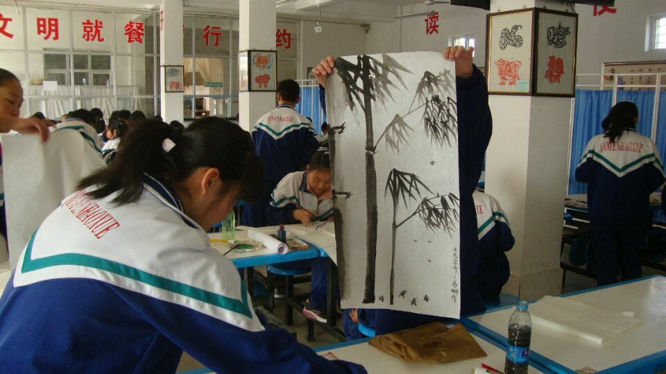 在国画创作中,一位同学已经创作出了一幅墨竹图。只见用水墨点染的的竹子身姿卓越,傲然挺立于天地之间。使人不禁想到了"未出土时便有节,及至凌云亦虚心。"风声一何盛,松枝一何劲"的意境。让人在方寸之间,深受启发。