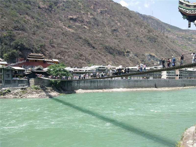 终于看到了慕名已久的泸定桥。桥架在宽阔的大渡河上,由十三根铁链架成。桥面上铺有木板,人走在上面有点晃。看着下面碧绿而湍急的河水,我的心里有点紧张了,一旦掉下去,几乎没有生还的可能,想到当初红军过桥的时候是多么不容易啊,那时的桥上连木板也没有。我们很小时候,老师就讲了"红军勇士抢夺泸定桥的故事",如今亲眼看见勇士们走过的足迹,才明白先辈们敢于流血牺牲的精神是多少崇高的啊,我们今天的幸福生活真的来之不易。