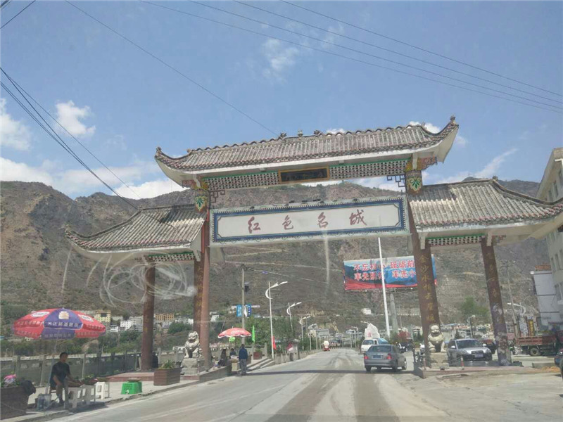 今年国庆节,终于有机会来到了泸定。首先,映入我眼帘的是一个高大的牌坊,上面的"红色名城"四个字显得格外醒目。抬头望向天空,有几朵缥缈的白云在天空中若隐若现,两边的大山显得格外高大。
