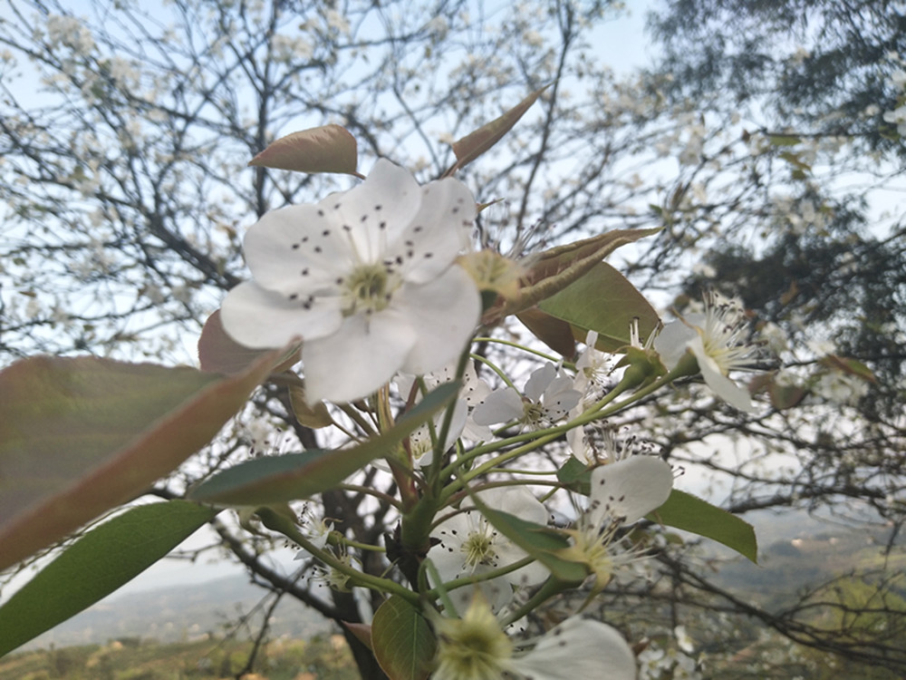 当我从更远的地方看的话,梨树就和天、树合为一体,承一幅知名作家画的山水画,极其的漂亮,好像有一幅与生俱来的亲和感,诗一般的画意。