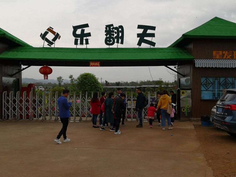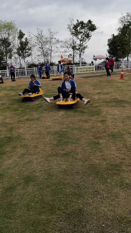 我们转了一大圈,看见了石碾,风车,鸡公车等等,才明白金堂乐翻天是成都乐翻天农业开发有限公司精心打造的一个约400亩、以农业观光体验为特色的农业风情园。集农业种植、园林观光、乡村游乐于一体的新概念体验式农业园。眼看着快到中午了,教官把我们带到此行的第一站——滑草。这个滑草场非常好大啊!据教官说,这滑草的场地面积约为8000平方米,草坡滑道全长为150米,有近10米的落差,在上面滑草能享受到飞翔的乐趣,可有趣了!我听了兴奋不已,跃跃欲试,再次把目光投向滑草的场地:蓝天白云,阳光明媚,扑面而来的泥土芬芳,令人心旷神怡的悠悠绿草牵动了我的全身细胞。我迫不及待地乘坐上专用的草地滑行车辆,同学从后面一推,车辆从山坡草地顶部自上而下缓缓自由滑行,由慢到快。那滑行的速度既让人害怕得心"咚咚"直跳,好惊险,又有飞起来的感觉,好刺激。这样的感觉特满足,好开心。我又滑了一次,这次我不怕了,竟然还张开双臂,仰望天空,纵情驰骋于绿意黯然的草坪之中,用心感受飞翔的乐趣。那刺激的飞驰动感,带给我无法比拟的享受,领略的是那份舒坦畅快、怡然自得的独特魅力。 。