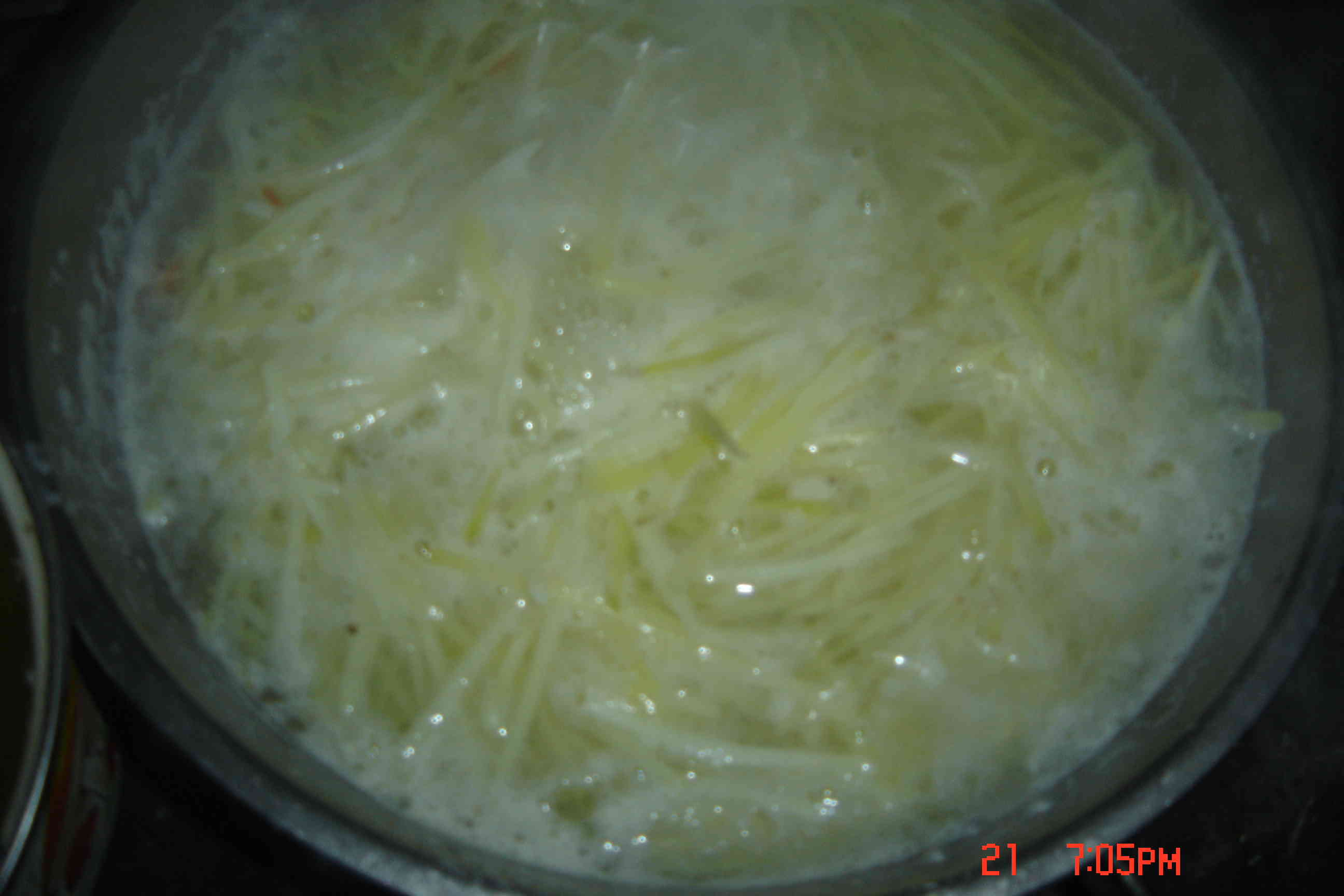 做洋芋丝的时候,首先你挑选出几个比较大的洋芋,洗净去皮,然后把洋芋切成细丝,把切好的洋芋丝放在水盆子里,搅拌几下拿出来,这一步主要是去粉,然后在炉子上放上锅,倒上一定的水,等水开后,你就可以把洋芋丝放进锅中,等上五到六分钟就可以出锅了,把水去掉放在碟子里,放上盐和佐料,在锅中倒上油,等油过后,把油倒在放好的洋芋丝上,均匀搅拌后你就可以吃上美味可口的自做的洋芋丝了。