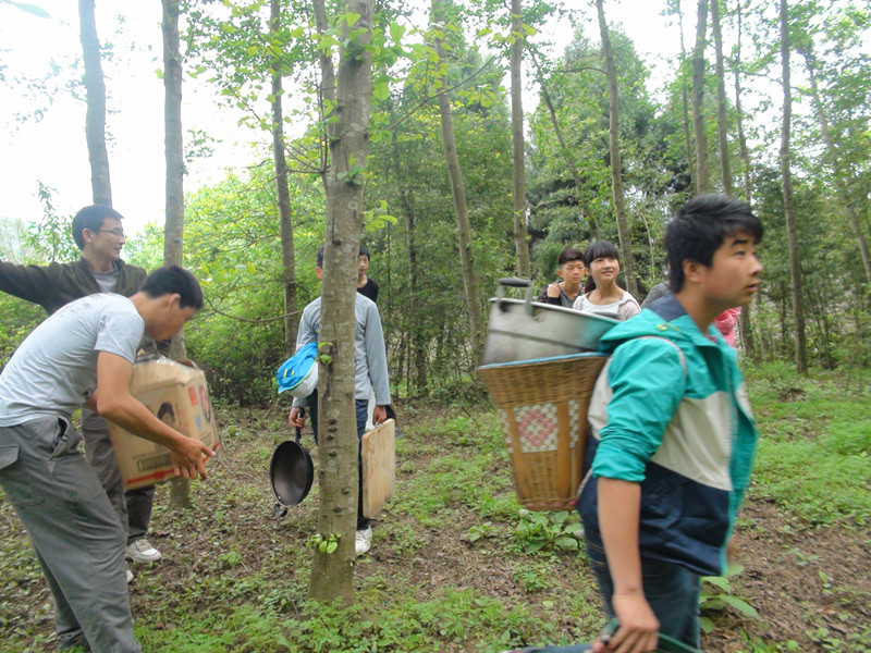 但见我们组的享有"大厨"美誉的卢江动作娴熟地铺开报纸,拿出菜板菜刀和蔬菜开始切菜了,菜刀很听话的在他手上挥舞,转眼间菜便切好了,大家赞不绝口羡慕不已。其余的人也不甘落后,都使出看家本领干自己分内的事。罗幸挖灶,由于工具落后,挖了半天都没挖好,最后还是在老师的帮助下才搞定的。我和另一个同学负责抬水,这个活儿最轻松(那是因为我们俩干不了别的,大家照顾我俩)。一切准备停当,就该生火做饭炒菜了。