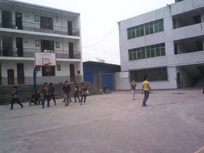 讲话台下边是两个大大小小的篮球场,一宽一窄,一长一短,这是我们的前操场(当然我们还有后操场了)。穿过篮球场,就会看到一座新建的办公楼,那是2008年灾后重建的,是老师们办公的场所。办公楼与新教师宿舍楼是被我们称为"最豪华"的两栋楼,真可谓是高端大气上档次。这两栋楼之间隔着学生食堂,从学生食堂往前走就到了我们学生宿舍,那是同学们起居的地方。
