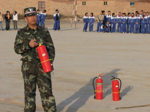 首先消防队队长讲话,告诉我们有关火的种类,灭火的方法,重点讲解了几种灭火器,它们的用途和使用方法。