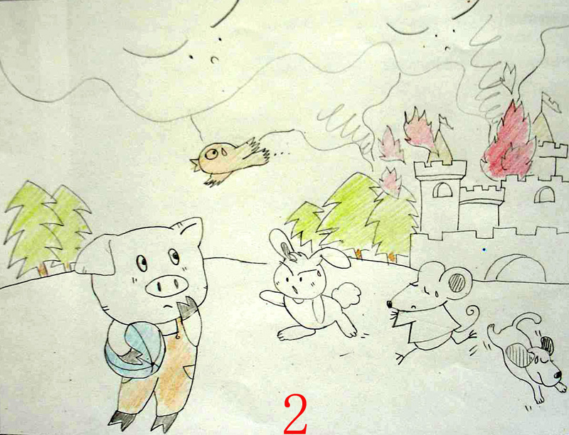 这时从王国里跑出了好多的动物,有小狗、小兔等,小猪马上上前打听,才知道动物王国里着火了。他向动物王国里望去,果然有浓烟和火光。