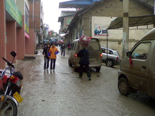 偶尔这条拥挤的路上还会来上一辆大型的货车,货车体积大,从这条路的话,一不小心就会刮到停在边上的汽车,行人就只有停下来让大车通过才能走。