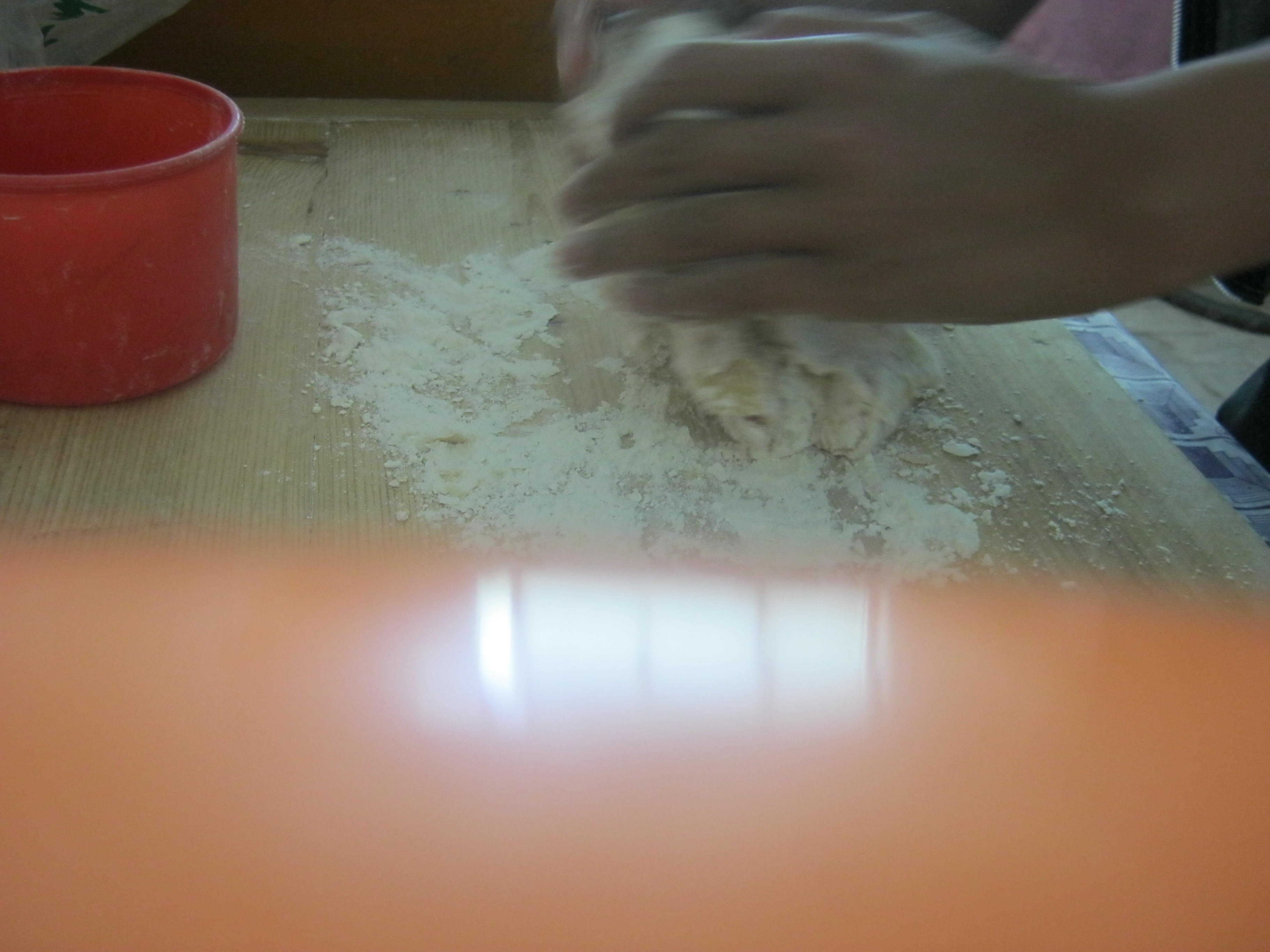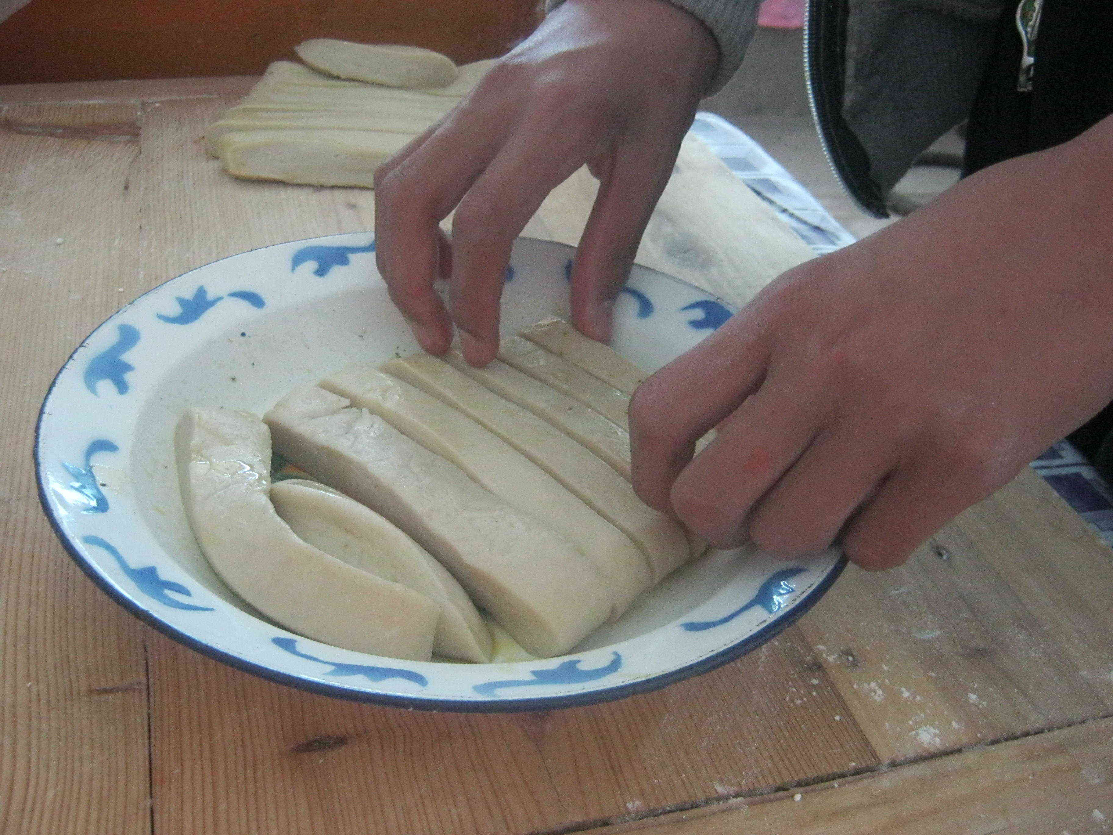 我首先取上面,就开始和面了,和了一会面,面团基本成形。于是,我又把它放在案板上揉,揉了好久,然后把面盆扣在上面。第二步,做菜,我挑了几个洋芋,把它们切成小丁,放在锅中爆炒了一下,然后盖上锅盖焖了十几分钟,就可以出锅了。