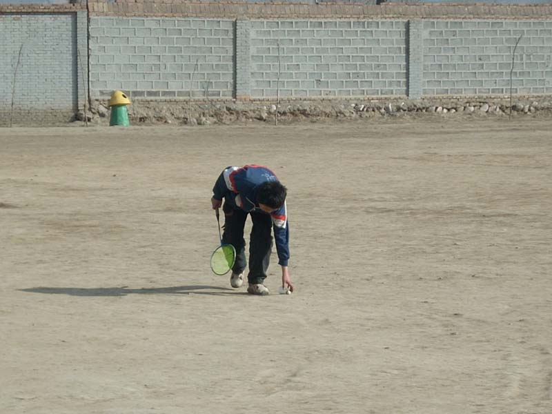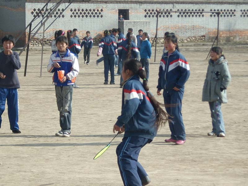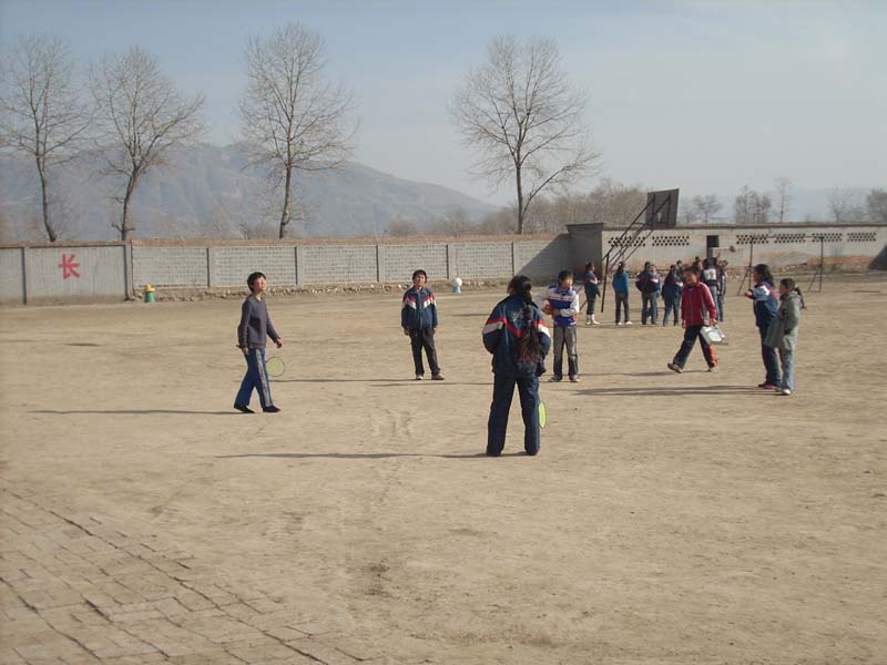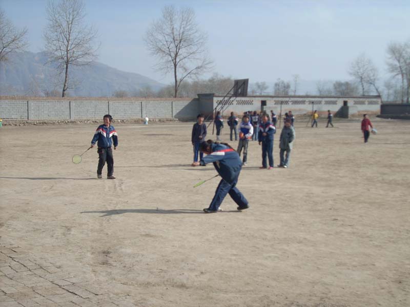 在操场里,男孩子早就霸占完了乒乓球案子。无奈,我们只有找其它运动项目了,还好。我们老师那里有一副羽毛球拍,我们就开始了打羽毛球的活动。虽然羽毛球很小,但是我们玩得还是津津有味。