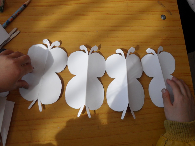 乐晓燕查看了一下我的"杰作",不紧不慢地说:"这个不仅要双层三折,在画半个蝴蝶时,纸的两边要连,不能剪断,要不然就剪成你这这样了!"Thankyou!"信心指数:★★★★☆