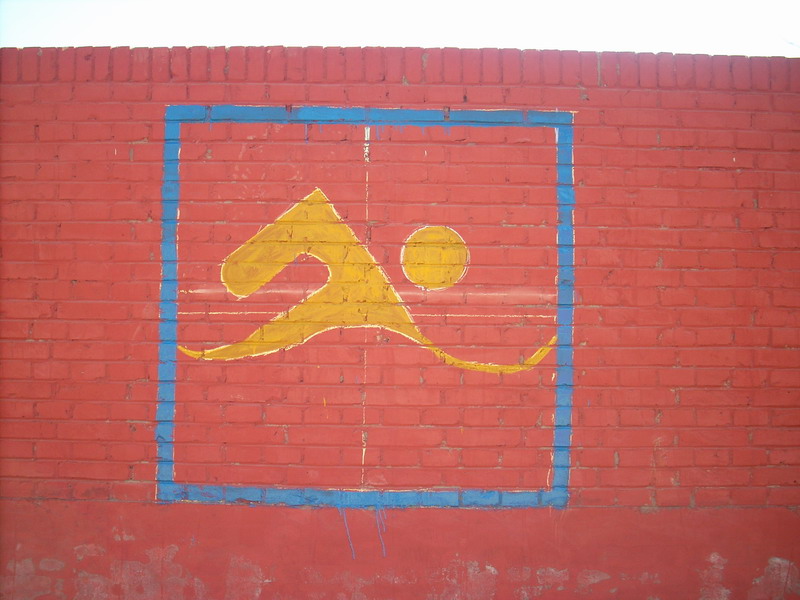 为了改善我们学校的校园环境,学校决定在学校的围墙和教室的外墙下面画一些简笔画,你看这墙上这幅画,一名游泳运动员在进行比赛,看上去非常形象,而且也非常真实。激起同学们一种运动活力。大家在课外活动时都聚集在围墙下,都来欣赏。