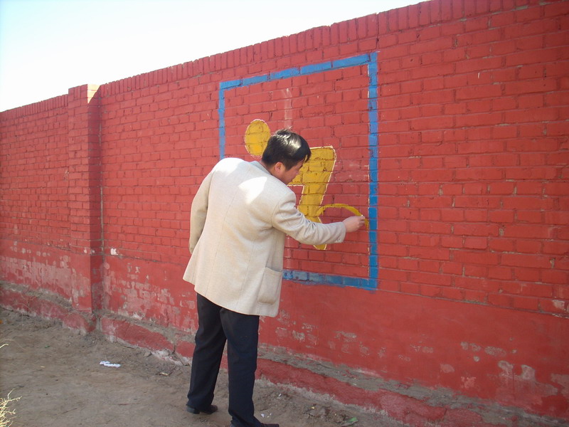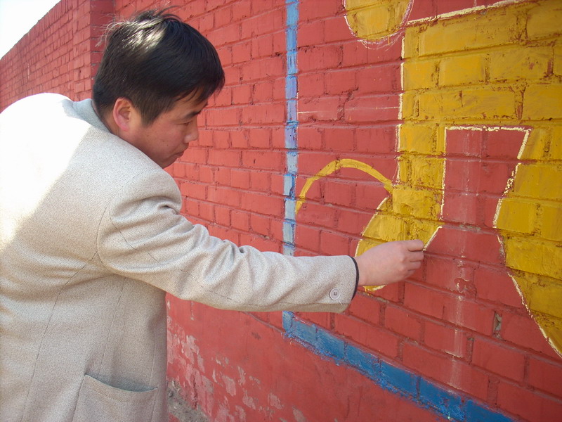 这位是我们的贾波老师正在墙上画画,他是一名物理老师,可是他的画画的非常好,很会用自己手中粉笔来展示运动的精神。他总是说:“同学们,我们不但要学习好,也要在艺术方面有发展呀,都来学习画画吧!”经他这样一说,同学们都要抢着跟随他去学习画画。他非常高兴答应了同学们的请求。
