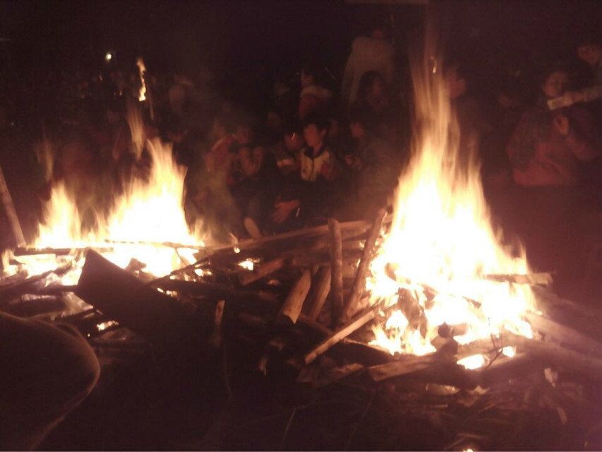 六点四十分,学校领导一声令下:"点火!","呼呼……"一堆堆柴火熊熊燃烧,一瞬间火光映红了校园,也映红了师生们幸福的笑脸。在熊熊火光中,主持人闪亮登场,她们用清脆的声音向师生和来宾们问好,并致以节日的美好祝愿。