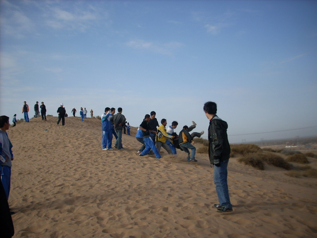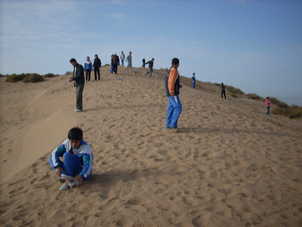 穿校服的这哥们玩的不亦乐乎,忘乎所已,直到鞋子里的沙子多得跑不动时,才停下来倒.穿黑衣服的那位帅哥心很细,也住在城里,悄悄的装了点细沙拿回去收藏.我们这些乡村的孩子对沙子很熟悉没有一个说是拿点儿回去的.
