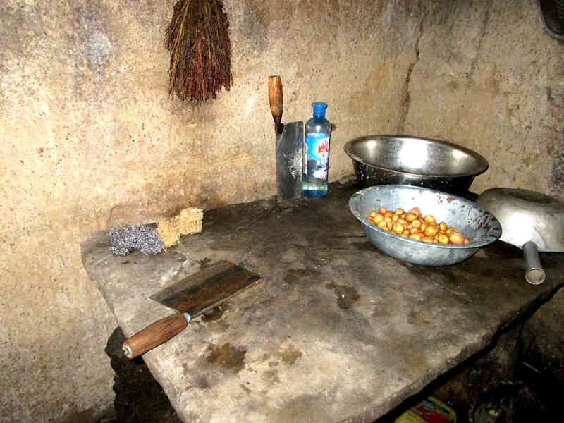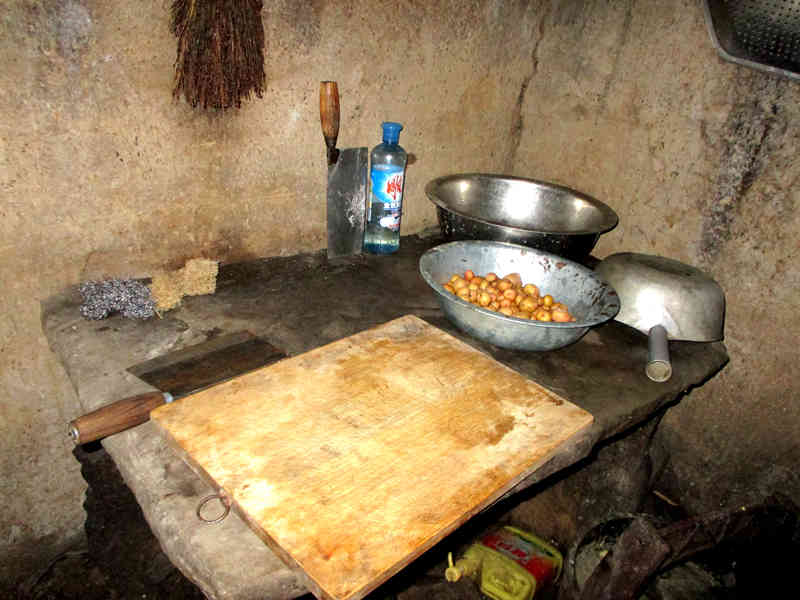 厨房的一角放着一块案板,其实也就是一整块大石板,这可是纯天然的材料哦,很是结实,在上面使劲砍骨头都没事,它都稳如泰山。这块案板使用了多年,它的表面已经非常平整、光滑,我们家经常在这上面切肉、切菜,偶尔也在上面和面包饺子。常用的一些盆子、水瓢、菜刀等也放在上面,它默默地承受着这一切,毫无怨言。