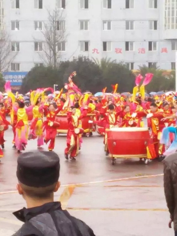 经过漫长的等待后,终于该我们上场啦。尽管在下着雨,尽管我们的表演服装很单薄,尽管冷冽的风吹得我们簌簌发抖,但我们依旧挺直了腰板,努力地将我们最好的一面展现出来。腰鼓手动作整齐划一,腰鼓声铿锵有力;仙女们舞动长袖,舞姿曼妙优美。我们尽情地表演着,观众看得如痴如醉。