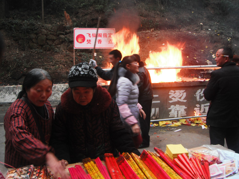 今年烧香祈福与往年略有不同,那就是人们在各处神龛佛像处虔诚祈拜后,将祈福后的香烛纸钱拿到"焚香指定点"集中焚烧。那是一个巨大的矩形炉子,炉子里香烛燃烧正旺。旁边竖着一个警示牌,上面写着"飞仙阁指定焚香点"。游人们纷纷将手中的香投入里面,再深深地鞠三个躬,以求神明的保佑。